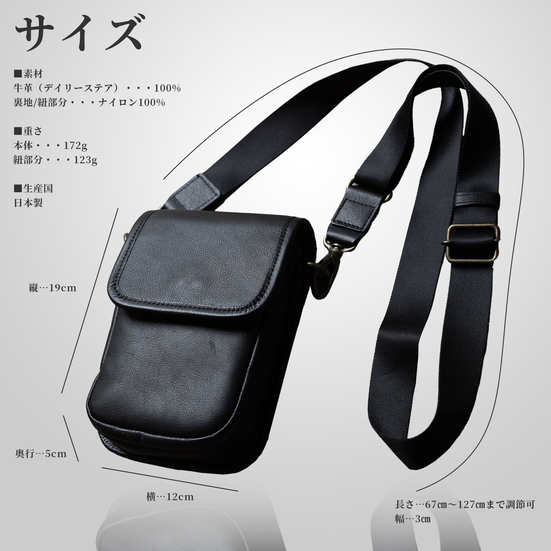ストラップ部の長さ…67㎝〜127㎝まで調節可
