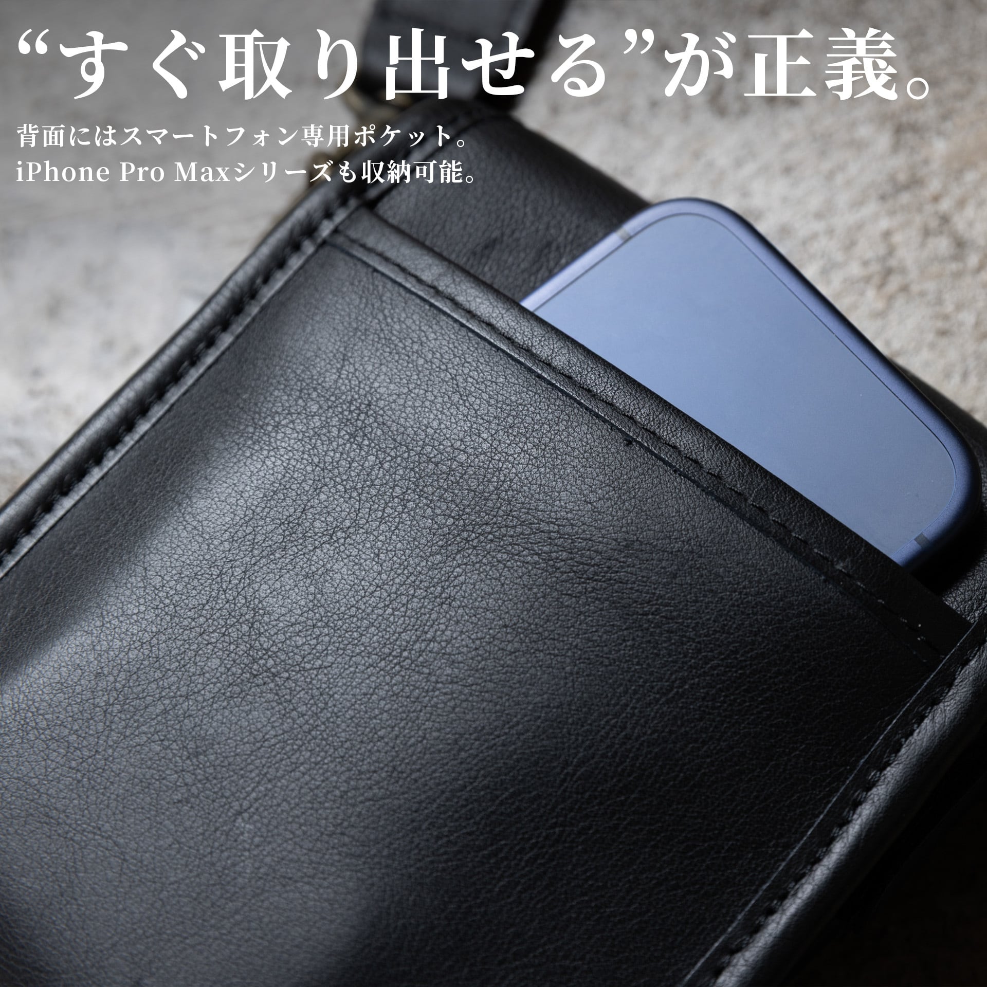 ・背面にはスマートフォンを収納できるポケット有り(iPhone Pro Maxシリーズ可)